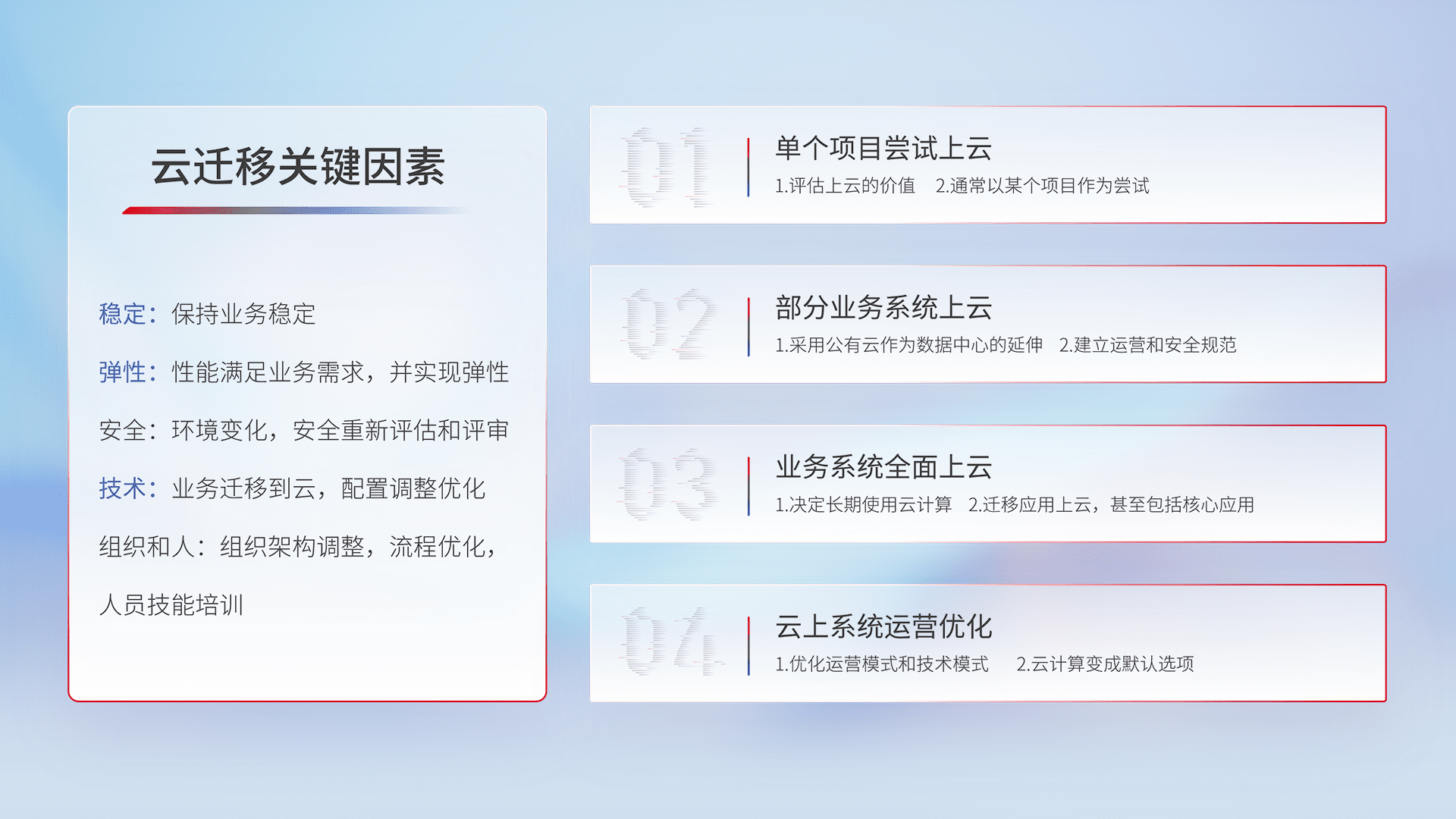 结合实际业务,,,从规划设计、、、云平台选型、、云原生改造、、数据迁移、、集成交付,,,迁移全过程为客户识别最佳上云路径,,,,做好风险识别管理,,设计网络架构、、身份权限、、、、安全审计合规、、、、操作审计、、日志审计、、监控告警策略、、、多站点容灾设计等,,,,对云上基础设施进行整体规划,,提升IT治理水平,,以满足弹性、、高可用、、高性能的需求。。