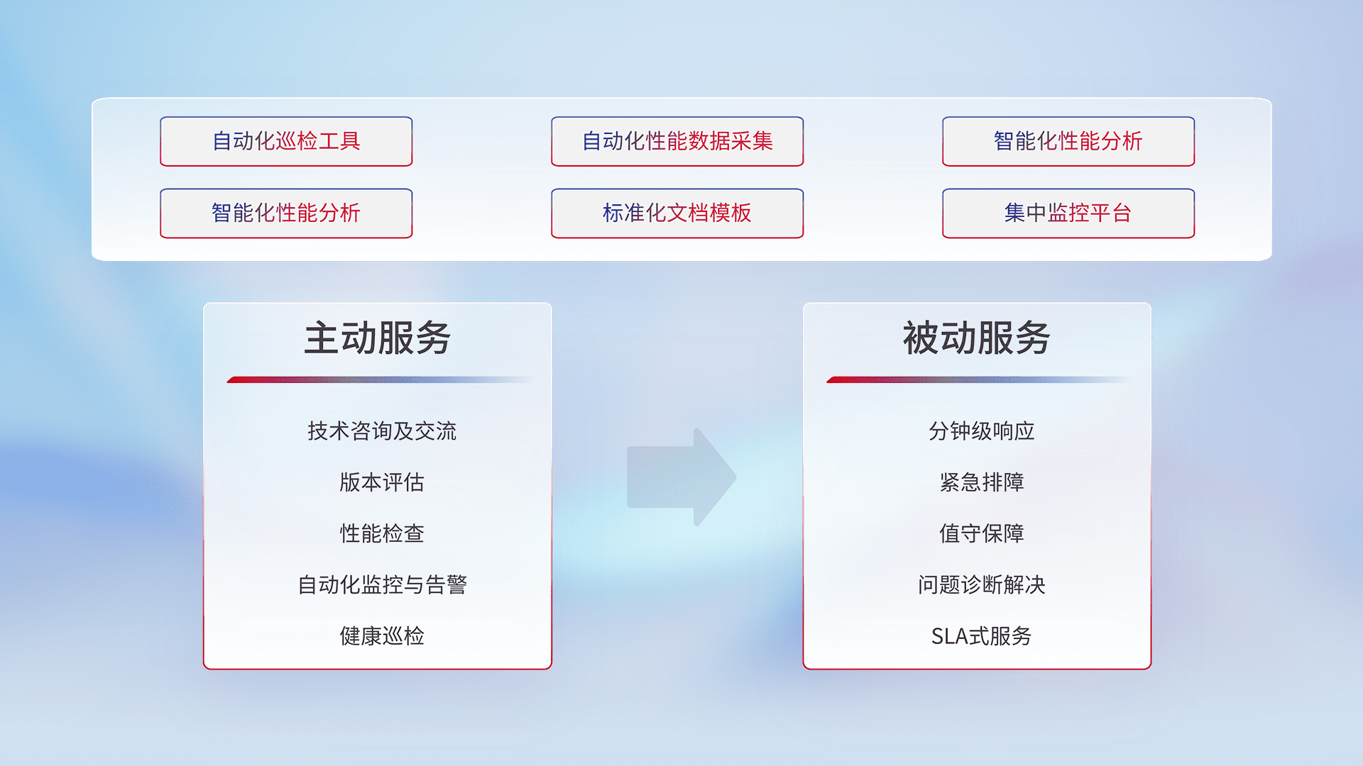 智能化工具和标准化文档,,,,保障服务质量,,,提供主动服务(包含技术咨询、、版本评估、、性能检查、、、、自动化监控与告警、、、、健康巡检)和被动服务包含(分钟级响应、、、紧急排障、、、值守保障、、问题诊断解决、、SLA服务)。。。。